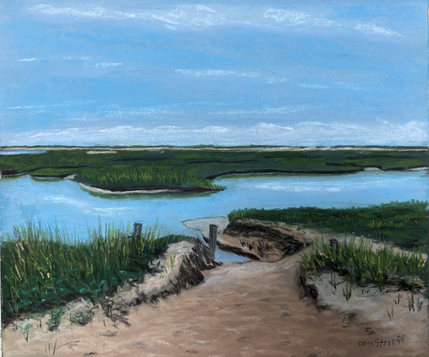 Den Streeff attended F.I.T in New York City as a graphic artist student and worked in the industry for several years in Manhattan and Boston. He moved to Ptown in the early nineties and began to explore the finer arts along with creative writing. Over the years he attended courses in all kinds of mediums searching for his voice. More recently he studied working in charcoal/conte/graphite with Kathy Smith. He studied white line printing under Kathy as well, which she is renowned for. He has taken painting classes with Steve Kennedy working in acrylics. In 2023 he fell in love with soft pastels after having taking Eileen Casey’s class at the Creative Arts Center in Chatham. Since then, he has further his studies in pastels taking classes at The Cultural Center of Cape Cod studying under different teachers. This past year he won a Barbara Stone Scholarship to study under a master pastelist. He is a member of the Pastel Society of Cape Cod and is a member of PAAM.